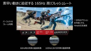 ディスプレイ解像度は3440 ×1440、DCI-P3は90%カバー。sRGB相当で121%の色空間をサポートし、より豊かな色を表現できるとする。HDR10に対応し、色差はΔE<2で、10ビットカラー対応。最高リフレッシュレートは165Hzに対応し、4msの応答速度を備える。こちらもTUVRheinland認証を取得したブルーライトカット、フリッカーフリー機能も備え、より快適な視聴が可能だとしている。