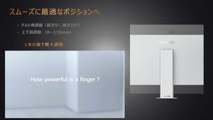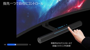 パネルはIPS。上部と両サイドのベゼル幅は6mm、下部のベゼルは9.3mmとベゼルレスデザインを採用。約12.8mmの薄型設計で、最大で110mmの上下高調整、チルト角調整は前方5°、後方18°まで可能。TUVRheinland認証取得のブルーライトカット、フリッカーフリー機能も備え、設定メニューはタッチバーで制御できる。
