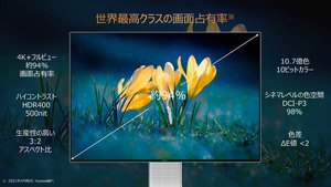 Mate Viewは、28.2インチの4K+(3840×2560)対応モデル。画面占有率は世界最高クラスの約94%を実現。アスペクト比は3:2で、16:9に対して約18.5%のスペース増となり、オフィスワークの生産性を向上させるとしている。色域はDCI-P3を98%カバーし、DisplayHDR 400をサポート。ΔE値<2(sRGB)の少ない色差によってリアルなカラー再現を実現する。