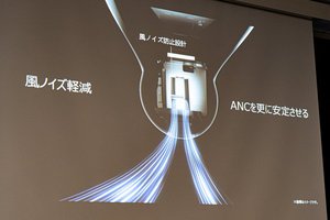 ANCは、フィードフォワードマイクとフィードバックマイクによる、ハイブリッド型を採用する。フィードフォワードマイクは、風ノイズを防止する設計を採用することで、ANCの安定性を追求。また、ANC自動最適化技術「AEM」により、ノイズ低減効果を前モデルの最大15dBから最大25dBに高めた。