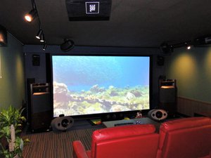 約20畳のスペースに、スチュアートのシネスコサイズ130インチと16:9 150インチのダブルスクリーンを備え、プロジェクターはJVC「DLA-V9R」、サラウンドシステムはメインスピーカーにJBL「K2 S9900」を据えた5.1.6chのドルビーアトモス。さらに、元パイオニアの友人の協力を得て実現したボディソニックを配し、「システムを紹介するときには、5.1.6.1chと紹介しています」と最後にボディソニックによる「.1ch」を添え、圧倒的な“没入感”を提供する。