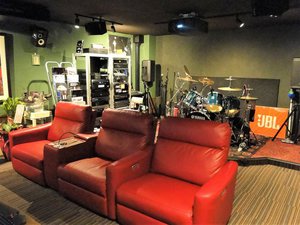 さらに「内装や照明もワクワクしてもらいたい」とインテリアには腰壁やグリーンの黒板、ブラックのオトテン、LED間接照明をコーディネート。機材もマウントラックで積み上げて、ロサンゼルスのカスタムインストールショップさながらの雰囲気を醸し出す。「やりたいことは全部やろう」と実現させた“HARD ROCK THEATER”だ。なお、対面にはバンドステージが設けられている。