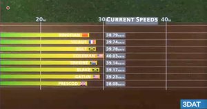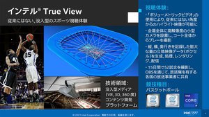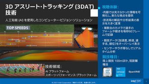 たとえば陸上競技のテレビ中継では、選手の名前や国籍はもとより、走っている時の最大速度や加速度などをリアルタイムでオーバーレイ表示する。これは3Dアスリートトラッキング(3DAT)と呼ばれる技術で、非常に早い選手の移動スピードに追従できる高精度カメラとインテルの高速プロセッサーにより、選手のフォームなどをリアルタイムで分析。精度の高い分析結果は、今後アスリートやコーチがトレーニングにも活用できるようになるとしている。
