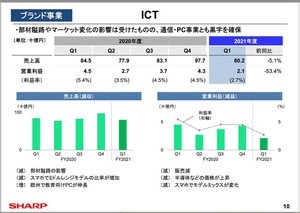 ICTでは、売上高が前年同期比5.1%減。「半導体隘路に加え、通信事業でミドルレンジの販売比率が増加したことによる。ただし海外PC事業が欧州で大幅に伸長した」という。営業利益は53.5%減。「販売減少に加え、半導体など部材価格が上昇したことによる。こうした状況下でも通信事業やPC事業はひきつづき着実に黒字を確保している」とした。