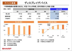 デバイス事業では、ディスプレイデバイスが売上高が前年同期比24.1%増。「半導体隘路の影響があったが車載向けが回復、PCタブレット向けも堅調で中型ディスプレイが伸長」という。営業利益は前年同期30億円の赤字から63億円回復し33億円の黒字となった。