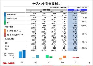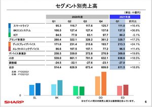 「白物家電、テレビは高付加価値化を進めたことなどから国内での好調が継続するとともに、海外も大幅に伸長。また新型コロナウィルスの影響から前年同期は業績が落ち込んだMFP事業と、ディスプレイデバイスが大幅に回復した」という。その結果、スマートライフ、8Kエコシステム、ディスプレイデバイスの3セグメントで売上高、営業利益が大きく伸長し、全社の増収増益を牽引した。
