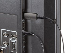 3.5mmステレオミニジャック接続でテレビの音声をワイヤレス送信できるBluetoothトランスミッター。電源についてはテレビ付属のUSBポートから常時給電する形を取る為「バッテリー切れの心配なくお使いいただけます」とアピールする。