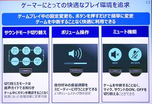 ゲーム用モードは「RPGモード」「FPSモード」「ボイス強調」が用意される。RPGモードではゲームの世界にいるかのような臨場感と迫力を演出し、FPSモードでは足音などが聞き取りやすいように正確な音の定位を再現、そしてボイス強調モードではシナリオに没頭できるよう人の声が聞き取りやすく調整される。