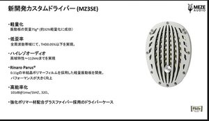 搭載するRinaro社製カスタムドライバー「MZ3SE」を搭載。全周波数帯域でTHD 0.05%以下の低歪率を実現し、3Hz - 112kHzまでの幅広い周波通帯域をカバーしており、ジャンル問わず高解像度と正確なサウンドを再現できるとしている。