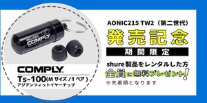 Shureの完全ワイヤレスイヤホン新モデル「AONIC 215, Gen 2」が発売されたことを記念してのキャンペーン。Shure製品なら同製品以外でもキャンペーン対象で、レンタル申し込み品にプレゼント品のイヤーチップが同封して発送される。なお、先着順でプレゼント品がなくなり次第終了となる。