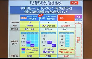 録画機能では、録画可能な番組数の上限を、従来の3,000から1万へと大幅に拡大。お録りおき機能で大量のドラマ・アニメを自動録画したり、5分程度の短い番組を多く録画するなどといった使い方にも配慮した。
