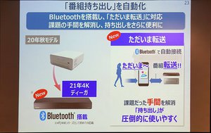 録画した番組を、無料アプリ「どこでもディーガ」をインストールしたスマートフォン/タブレットへWi-Fiでワイヤレス伝送して持ち出すことなどができる機能も引き続き搭載。写真の保存や番組持ち出しを帰宅時に自動で行える「ただいま転送」に新たに対応した。