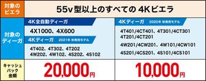 対象の4Kビエラは55型以上のモデルすべてが対象。4Kディーガは、4K全自動ディーガ「DMR-4X1000」「DMR-4X600」、および2021年秋発売モデルが2万円キャッシュバックの対象。2020年秋発売モデルが1万円キャッシュバックの対象となっている。