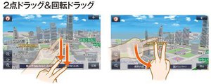 操作面では、2点ドラッグの上下で地図の俯瞰度合いを調整し、2Dから3Dへと切り替えることが可能。円弧を描くような2点ドラッグをすることで、地図の回転も行える。メニュー画面をカスタマイズする「簡単ツートップメニュー」が強化され、一覧からのメニュー画面に表示したい機能の設定、アイコンのドラッグでの移動に対応する。