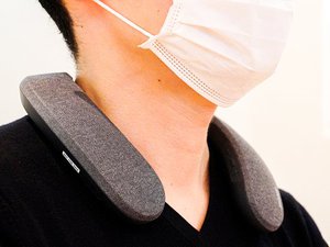肩に乗せて使用するウェアラブルタイプのスピーカーシステム。本機付属のトランスミッターをテレビ等に接続してワイヤレスで使用する形で、本体とトランスミッター間はBluetoothで通信する。映画やライブ動画に最適なモデルとして、既発の「SRS-WS1」「SRS-NB10」との併売で、ユーザーのニーズに併せた3機種を展開していくとのこと。