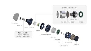 また、2基のBAドライバーには、マイク部同様Knowles社製品の中から、よりワイドレンジな高品位ユニットを採用。ダイナミックドライバーには、本格スタジオモニターにも採用されるパルプコーン振動板にヒントを得た、PETチタンコンポジット素材に高密度パルプを貼り合わせたデュアルレイヤー振動板を採用。内部損失を高め、固有音の減少を図りつつ、振動板の軽量化とマグネットの強化により応答スピードを向上させたとしている。