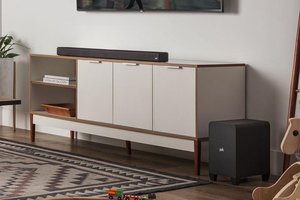 ドルビーアトモスに対応する、3.1.2chサウンドバー。上向きにサウンドを放射して反射音により立体空間を再現するイネーブルドスピーカーを含めた、5基のドライバーユニットをサウンドバー本体に搭載し、頭上を含めた全方位にサラウンドサウンドを再生できるとする。付属のサブウーファーはワイヤレス接続のため、好きな場所に設置することが可能だ。