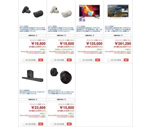 セール会場では、ソニーの完全ワイヤレスイヤホンや4K液晶・有機ELテレビが値下げされ、さらに20%ポイント還元となっている。またデノンのサウンドバー、jvcの完全ワイヤレスイヤホン、GoProのカメラなどもセール対象となっており、要注目だ。