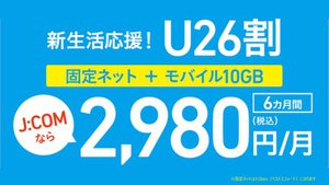 さらに2022年1月6日からは、J:COM NETとJ:COM MOBILEを新規で同時申し込みする26歳以下のユーザーを対象とした「新生活応援!U26割」を展開予定。対象は「J:COM MOBILE AプランST(5G/4GLTE)」の5GB/10GB/20GBプランのいずれか、および「J:COM NET」の新社会人応援U26割プランの同時加入。なお、J:COM NETは「J:COM 学割」プランの場合でも適用される。