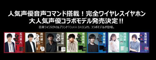 ユニバーサルミュージック合同会社は、7名の声優のオリジナル音声が収録されたTOoKA BASE完全ワイヤレスイヤホンのコラボレーションモデルを12月15日より発売する。価格は14,300円(税込)。先行して予約販売をARTIST BASE公式ショップ、UNIVERSAL MUSIC STORE、アニメイト通販、HMV&BOOKS ONLINE、タワーレコードオンライン、TSUTAYA ONLINE、Loppi(全国のローソン/ミニストップに設置)にて受付を開始している。