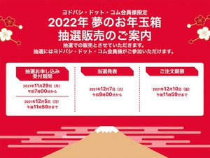 ヨドバシ・ドット・コムは、11月29日7時から「夢のお年玉箱」の抽選申し込み受付を開始する。申込みの締め切りは12月5日23時59分まで。また当選発表は12月7日9時から、注文期限は12月10日23時59分までとなる。