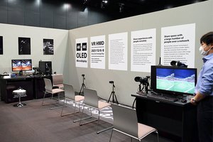 最初に登場したのは、片目で4K、両目で8Kの高解像度映像により3D空間をより高精細に映し出す「VRヘッドマウントディスプレイシステム」。より現実に近い映像表現が可能で、これはCMOSイメージセンサーやディスプレイ開発で培った技術を生かした「OLEDマイクロディスプレイ」によって実現しているという。