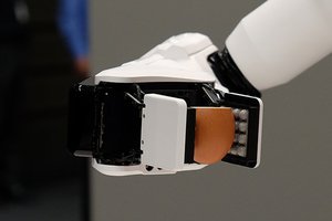 実際にその指先に当たる部分は、猫の肉球のようなぷにぷにとした柔らかい素材でできており、この部分の裏側にセンサーが搭載されているのだという。滑り落ちる動きを数理モデル化して、掴む力を制御する仕組みをとっており、さらに上下に4つずつ備えられた赤外線センサーが、対象物の距離を測って、どのような向きでも滑らずに持ち続けられる程度、かつ最小限の力で安定して物を持つことができる。