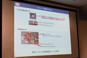 またAV用のクロックについては、通常のpsオーダーよりも精度が高い、fsオーダーの超低ジッターPLLを使用。こちらも電源が強化されており、ローカルレギュレーターとチップフィルムコンデンサが採用される。