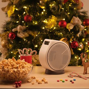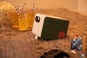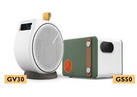 GV30は、円形の特徴的な形状により、135度までの角度調整を実現したモバイルプロジェクター。白い壁や天井だけでなく、ロフトや傾斜のある天井などにも投写が行える。本体には2.1ch のBluetooth対応スピーカー、Android TV 9.0を搭載し、単体でさまざまなコンテンツを楽しむことができる。