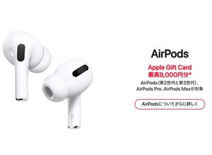 AirPodsは第3・第2世代、AirPods Pro、AirPods Maxを購入すると、最高9,000円分のAppleギフトカードがもらえる。