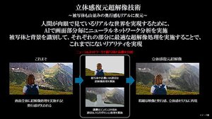 レグザエンジン ZR αには、「立体感復元超解像技術」を搭載。超解像処理を行うにあたり、AIで画面部分毎にニューラルネットワーク分析を実施。例えば、ある風景で人物が映っているようなシーンにおいはて、被写体と背景を識別して、それぞれの部分に最適な超解像処理を施す。被写体や近景には適切な超解像処理を行う一方で、遠景にはエンハンスを弱めて適切なノイズリダクション処理を行うことで、これまで画面全体に超解像を施した際に失われてしまっていた奥行き感や立体感をリアルに再現するという。