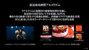 テレビ番組に対しては「放送波高画質アルゴリズム」を搭載。リアルタイムに複数回の超解像処理を実施し、テロップまわりのモスキートノイズや平坦部のノイズをはじめとする放送波のさまざまなノイズを低減しながらも、動きのある映像で発生する残像を抑制する。加えて、さらに拡充した3Dカラーデータベースによって、鮮やかに色彩を表現するという。山内氏は「例えば地デジのバラエティ番組でのワイプ映像は、縮小するからなのか、出演者の顔がギラついて見えることがあるが、今回のアルゴリズムで処理することで自然な映像になる」と説明した。