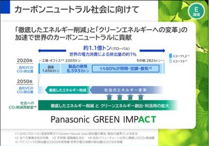 また2050年に向けて重点的に、「B to BやB to Gのお客様にエネルギー削減とクリーンエネルギー創出・利活用の提案を通して、社会のエネルギー変革に貢献する」とした。これをPanasonic GREEN IMPACTとし、グループ全体で拡大にコミットするという。「グループの多様な事業を通じ、くらし、街、モビリティ、サプライチェーンの領域でCO2の削減貢献を加速する。生産で使用するエネルギーを削減、無駄のない使い方をし、化石原料から電気へシフトし、供給エネルギーを再生可能エネルギーへ置き換える。さまざまな産業での需要サイドのアクションが供給サイドの再エネ化を加速させることが社会のエネルギー変革を生むインパクトになる」。