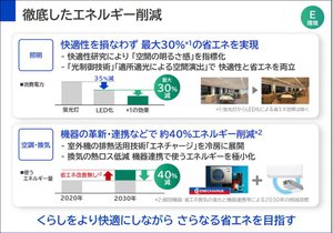 エネルギー削減の事例として、照明で快適性をそこなわず最大30%省エネを実現する、機器の革新、機器の連携などで2030年までに40%のエネルギー削減を目指す、といったことが挙げられた。そして、社会のエネルギー変革への貢献取り組みとして、電化を進める必要があるとし、ヒートポンプ式温水暖房機、IH調理器などの例が挙げられた。また、エネルギーの有効活用による排出量削減とりくみとして、低い環境負荷の吸収式冷凍機によるコージェネの排熱利用などが挙げられた。