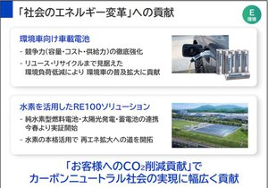 また、社会のエネルギー変革への貢献として、環境車向け車載電池の戦略を紹介。円筒型で主流となる4680セルは、生産性を向上させコスト力を高めるという。現在主力の2170セルの需要拡大に対応し、北米で生産ラインを増設した。これにより環境車普及拡大の貢献を目指す。水素を活用したRE100ソリューションの実証も、滋賀県草津の燃料電池工場で今年春より開始されるという。