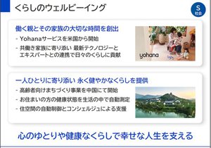 くらしのウエルビーイングでは、昨年9月に米国でスタートしたYohanaサービスが挙げられた。共働き家族に対して、専属アシスタントがAIを活用し、暮らしに沿った提案や支援を行うパーソナルアシスタントサービスで、地域のエキスパートとも連携しているという。また高齢化が進む中国でのまちづくりの取り組みも挙げられた。住空間の事業制御と、コンシェルジュによる対面サービス、身体や認知機能低下を予知するサービスなどを提供するという。