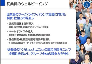 お客様へのウェルビーイングの実現は、従業員のウェルビーイングでも競争力をもたなくてはならない。グローバル24万人の社員に対して、ワークライフバランス実現は責務だと考えているとした。具体は事業会社で検討し、労働組合と協議するが、選択的週休3日制導入や、ホームオフィス導入などを目指す。評価制度や役職選考制度を見直す。役職者の女性比率が低い現状を早急に変えていくという。