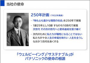 あらためてサステナビリティの視点でこれが説明された。「松下幸之助氏は、物と心がともに豊かな理想の社会の実現を250年かけて実現するとした。10世代をかけての遠大な取り組みであり、しかも次の世代のために自分達が犠牲になるのでなく、自ら人生の幸福を味わい全うし、なお次代をよくすること。まさに心身ともに幸せなウェルビーイング、サステナブルの考え方がパナソニックの使命の根源である」と語った。