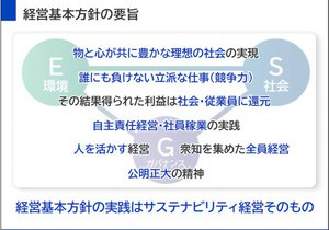 経営基本方針の要旨は「まさにESG。環境(E)、社会(S)、ガバナンス(G)に沿ったもの」だとコメント。理想の社会実現に向け、「立派な仕事をするのは、環境と社会の視点、すなわち地球環境問題の解決や心身の健康と幸福にお役立ちを果たし、得られた利益を社会に還元し、さらなるお役立ちに向けた投資にまわすこと。環境社会へのお役立ちを持続するガバナンス視点での自主経営、社員一人ひとりの稼業の実践、人を生かし衆知を集めた経営、公明正大の精神をうたっている」とした。