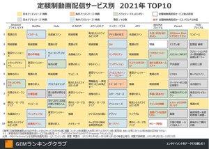 GEM Partnersは、2021年の定額制動画配信サービスにおける視聴ランキングの総括を発表した。