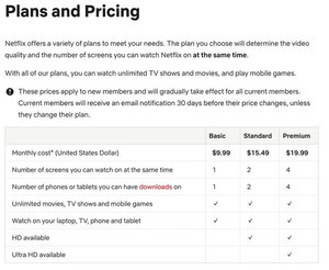 米Netflixは、同サービスで用意する「ベーシック」「スタンダード」「プレミアム」の全プランについて、北米での月額料金の値上げを実施した。