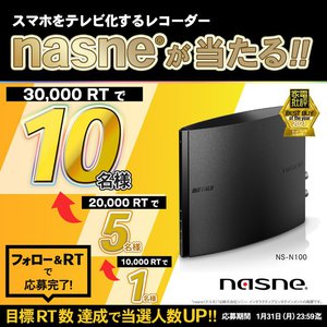 バッファローは、公式Twitterのフォロー&RTで抽選で最大10名にnasneが当たる『スマホをテレビ化するレコーダー「nasne」が当たるプレゼントキャンペーン』を、本日1月24日から31日まで8日間実施する。