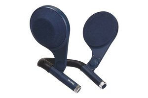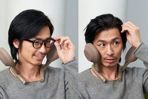 100mm口径のステレオスピーカーを限りなく耳に近づけるという製品形状が特徴のモデル。迫力ある重低音と立体感が、まるで映画の世界の中やライブ会場のど真ん中にいるような、これまでにない音の世界の体験を実現するとしている。