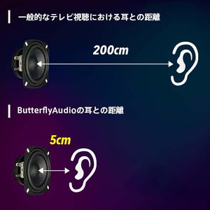 この形状は、圧倒的な臨場感を味わうために不可欠な重低音を、家庭環境で再現するには騒音クラスの音圧レベルが必要になるところ、「スピーカーを耳に近づけ、低音域はキャンセルする」という発想により生み出されたものだという。スピーカーと耳の距離は約5cmで、一般的なテレビの視聴長距離2mに対して、0.0625%のエネルギーで迫力あるサウンドを実現したと説明する。