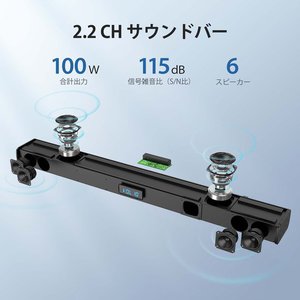 低音域用ウーファー2基とフルレンジスピーカー4基の計6基のスピーカーを搭載する、2.2chサウンドバー。合計100Wの出力により、迫力ある重低音と歪み感のないクリアな中高域を実現したとしている。