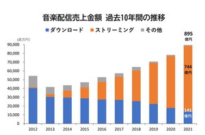 一般社団法人日本レコード協会は、同協会加盟全社の集計による2021年第4四半期(10-12月)の音楽配信売上実績を発表。同期の売上は前年比114%の236億円となり、結果、2021年の年間売上は対前年比114%の895億円になったという。