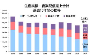 さらに先月発表された2021年の音楽ソフト生産金額(1,936億円)と合わせての売上合計は、対前年比104%となる2,832億円。2018年以来、3年ぶりのプラス成長であり、音楽ソフト:配信の比率は68:32と、初めて音楽配信が3割を超える結果になった。