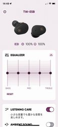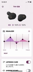連続再生時間は、イヤホン単体で約8.5時間、ケースでの充電を含め約30時間。本体はIPX5相当の生活防水に対応している。ほか、専用アプリとして、新開発の「Headphone Control」が用意され、バッテリー残量などの状態確認や各種機能のオン/オフ、イコライザー設定などが可能。中でもイコライザーは、パラメーターを大きく変化させた場合でも全体的な音のバランスが破綻しないようこだわって設計しているとのことだ。