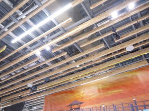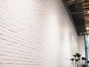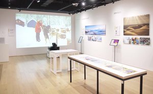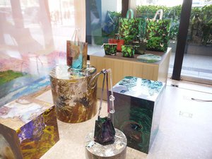 「エプソンクリエイティブスクエア赤坂」では、壁紙や天井に設置されたバナー、テーブルトップ、さらに天井ルーバーに、エプソンの大判インクジェットプリンターで実際に出力したものを用い、出来栄えを披露している。洋服やバッグ、テントなども展示されており、さまざまに広がるプリンターの可能性を表現している。