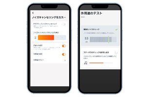 イヤホンのパーソナライズ化など各種設定を行える専用アプリ「JBL Headphones」を用い、ノイズキャンセリング効果をユーザーにあわせて最適化する「外耳道テスト」や、最大7段階のノイズキャンセリング/外音取り込みレベルのカスタマイズ、低・中・高3段階のボイスアウェア機能の調整、ノータッチでボイスアシスタントを設定できる「ウェイクワード」を設定することができる。